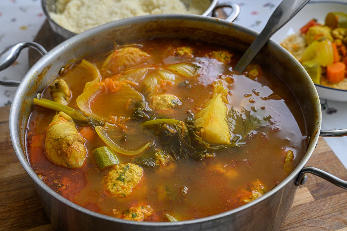 נקפיץ ב4 כפות שמן זית את חלקי העוף, כרוב, תפחי אדמה ובצל, אחרי כ-5 דק’ נוסיף תבלינים חמים רסק עגבניות ושום, דלעת, גזרים, קישואים וחומוסים, נוסיף מים עד 3/4 גובה הסיר ולבסוף, סלרי ועשבי תיבול,