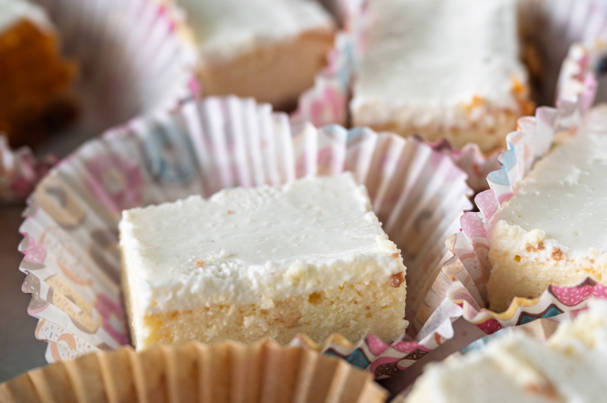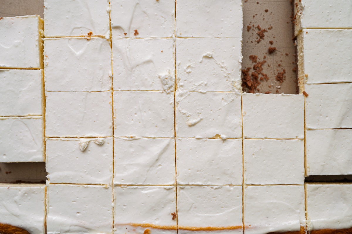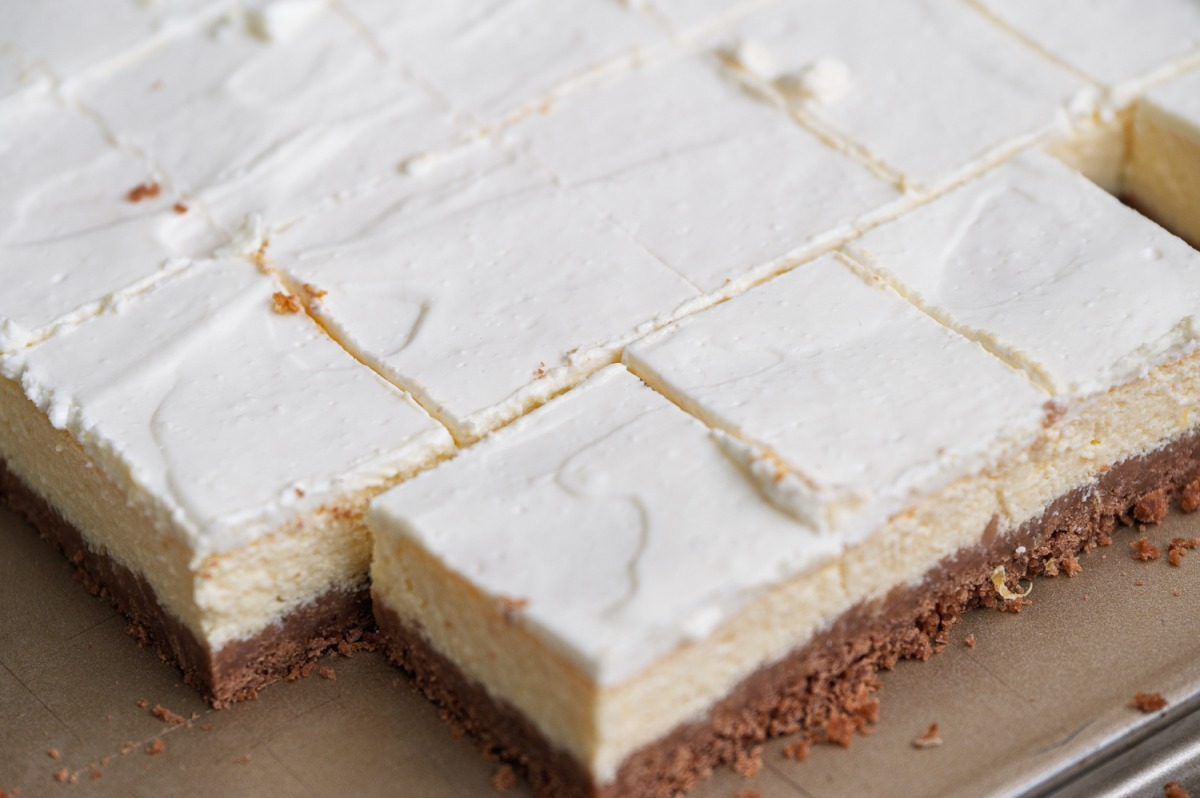 הרכבה: נמרח את הקרם ונכניס לצינון של כמה שעות יפות במקרר. נחתוך לחיתוכיות של 3X4 ס”מ. אין מילים.