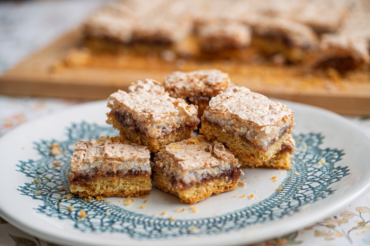 אלה חיתוכיות ילדות ישראלית עם מרנג קוקוס וריבה, לפני כמה ימים הכנתי עוגת מרנג אגסים נהדרת, שזרקה אותי במנהרת הזמן של דאג וטוני לימים של ריבועי הקסם האלה, שתמיד פרחו בפורים, הן הכי מתאימות למשלוח מנות.