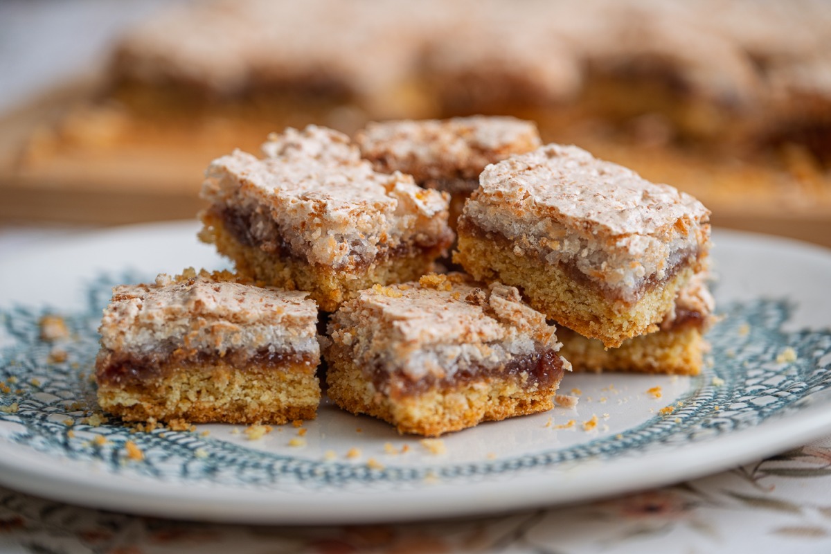 אלה חיתוכיות ילדות ישראלית עם מרנג קוקוס וריבה, לפני כמה ימים הכנתי עוגת מרנג אגסים נהדרת, שזרקה אותי במנהרת הזמן של דאג וטוני לימים של ריבועי הקסם האלה, שתמיד פרחו בפורים, הן הכי מתאימות למשלוח מנות.