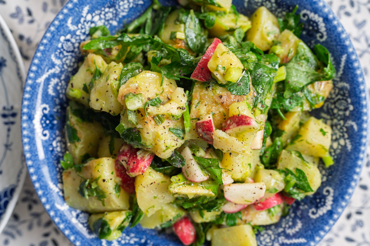 נחתוך צנוניות עשבי תיבול וחסה/רוקט או ריג’לה, נקלוף את השורשים שלנו ונחתוך לקוביות גדולות יחסית שנרגיש את הטעם הנהדר